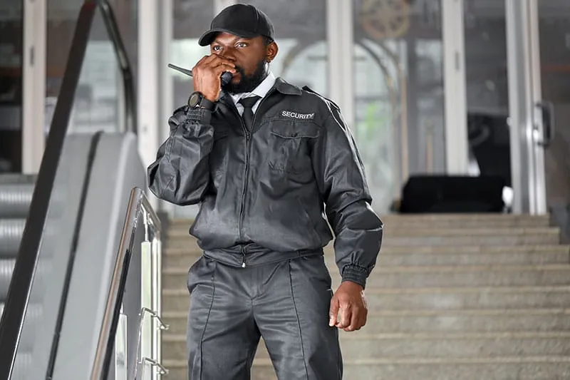 Sicherheitsmitarbeiter spricht in Funkgerät im Freien.